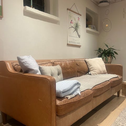 Sofaen er god at sidde i og uden skavanker på ramme, bund eller fjedre. Hynderne har massere patina - men ville have godt af en restaurering og udskiftning af skum.