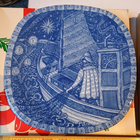 Smuk L Hjorth juleplatte fra 1923 i fejlfri stand . Klassiker fra Bornholm udført i brunt stentøj. Motiv: engel med trearmet lysestage. Ø: 18 cm