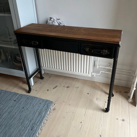 Smukt gammelt bord på hjul, som kan slås ud på begge sider, og derfor er meget fleksibelt.