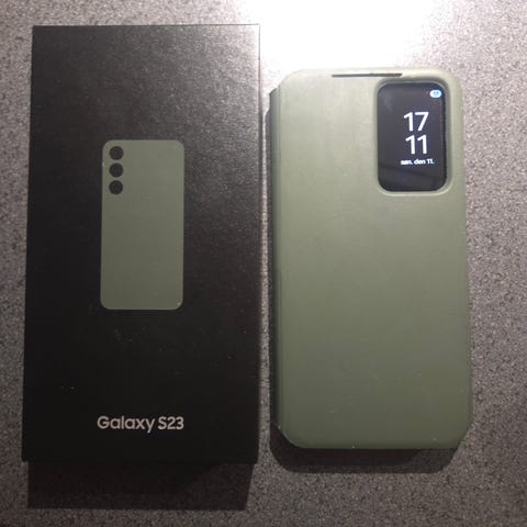 Samsung Galaxy S23 mobiltelefon med 256 GB lagerplads. Telefonen har en mørkegrøn farve og avancerede funktioner til daglig brug. Original emballage + 5 covers medfølger