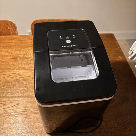 Køkkenchef isterningemaskine i sort farve. Maskinen har et gennemsigtigt låg og leveres med en målekop. Velegnet til fremstilling af isterninger hjemme. Brugt meget lidt og derfor ingen brugsspor. Kontant afregning eller mobilepay ved afhentning.