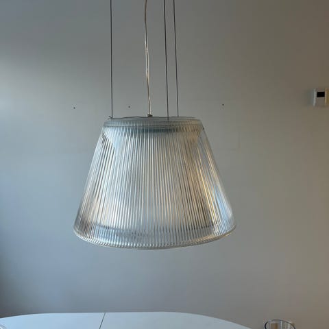 2 stk sælges, prisen er pr styk. Glaspendel diameter 34 cm og højde 21 cm. Længde af wire 1,1 m til ophængning, lampen vejer 4,5 kg. Længde ledning 1,25 m. Nye wires, roset eller andre reservedele for lampen kan købes ved www.lampemesteren.dk. Fra ikke ryger hjem.