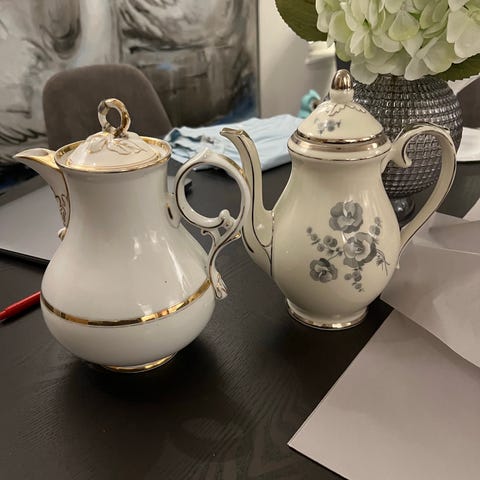 Kakao- eller vandkande i porcelæn med blomster og guldkanter.