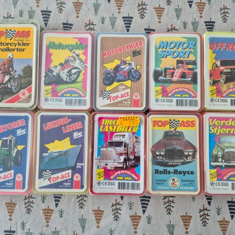 Bilkort motorcykelkort formel 1 rally Rallye turbo vesttyske luksusbiler offroad traktorkort Mercedes Benz Rolls Royce Porsche top ace top ass motorsport sportsvogne togkort kampvogne trumfspil supertrumf kvartetspil kortspil lastbiler trucks luksusliner