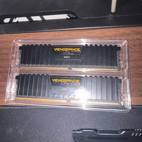 Corsair Vengeance DDR4 RAM med en kapacitet på 16GB og en hastighed på 3200MHz. Modulerne er designet til at forbedre computerens ydeevne og er kompatible med systemer, der understøtter DDR4 hukommelse.
