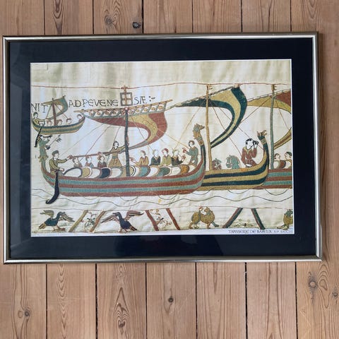 40 x 60 cm, Bayeux Tæppe Reproduktion til vægophæng, der viser historiske scener med vikingskibe og ryttere. Dekorativt tekstiltryk velegnet til vægmontering.