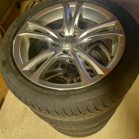 17-tommer alufælge med vinterdæk. 215/55/17 centerboring 57.1. ET40. Masser af mønster tilbage på dækket. Passer til Audi, Volkswagen, Mercedes, Seat, Skoda, BMW, Mini Cooper. Prisen kan forhandles.