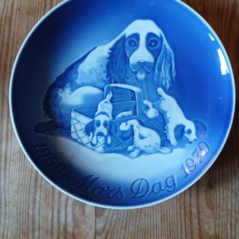 Bing & Grøndahl Mors Dag 1979dekorationsplade med motiv af hunde. Pladen er fremstillet i porcelæn og har blå og hvide farver. Den er designet til at blive brugt som dekorativ genstand, særligt til Mors Dag.