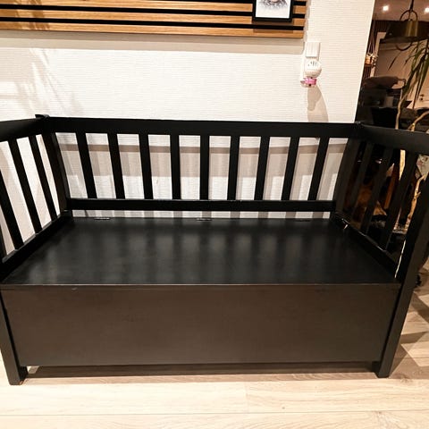 Bænk med hynde og tre rum under hvor der er sorte kasser til opbevaring