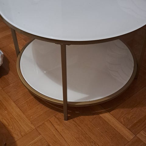 Bordplade i sort glas og stel i guld pulverlakeret stål.