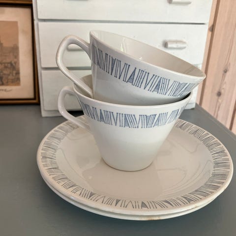 Jeg har to kopper og underkopper, de måler 10 cm i diameteren. Underkopperne har synlige brugsspor, der hvor koppen står.