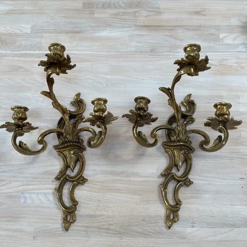 Antik væglampe fremstillet i metal med dekorativt beslag og ophæng. Lampen er designet til vægmontering og har en patineret overflade. Den har elektrisk fatning til pære og ledninger til tilslutning. Velegnet til brug som belysning i hjem eller historiske miljøer.