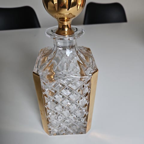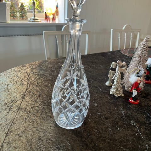 Krystal karaffel med mønster i klart glas. Karaffelen har et dekorativt slebet design og en smal hals med prop. Velegnet til opbevaring og servering af vin eller spiritus.