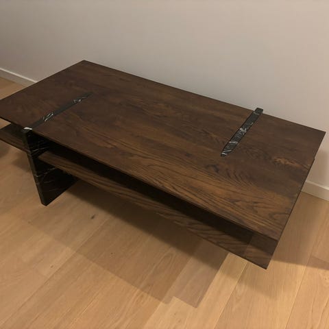BOLIA sofabord i sortmarmor med sort stel og magasinholder i sort læder