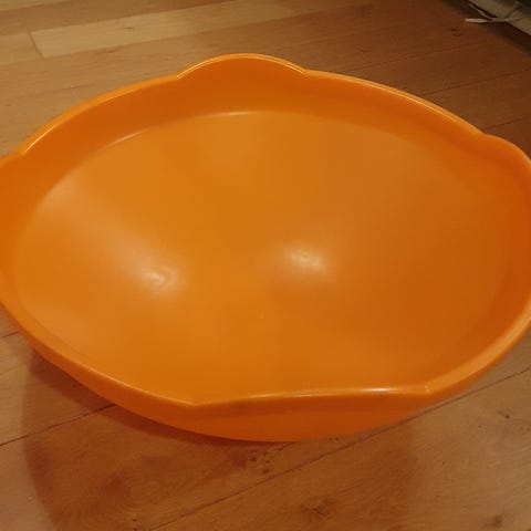 Orange tumletop fra Gonge (Tummelumsk, snurretop). Passer til børn i alderen 0 - 4 år. Den kan bruges både ude og inde og er designet, så fingrene ikke kan komme i klemme.
