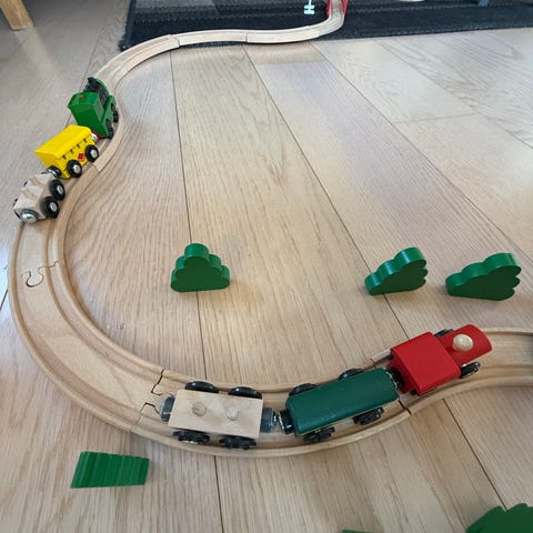 BRIO trætogbane sæt bestående af flere træskinner og tilbehør. Sættet indeholder buede og lige skinner samt forskellige tilbehørsdele til opbygning af en togbane. Materialet er træ, og det er designet til børn.