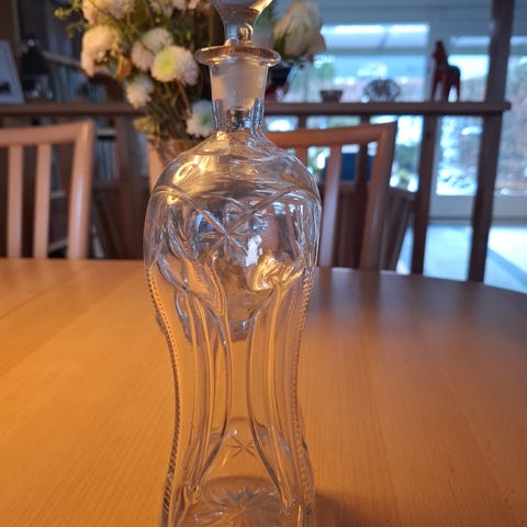 Krystal karaffel med et detaljeret mønster og tilhørende krystalprop. Karaffelen har en rund form med en hank og en firkantet bund. Den er fremstillet i klart krystalglas og egnet til opbevaring af drikkevarer.