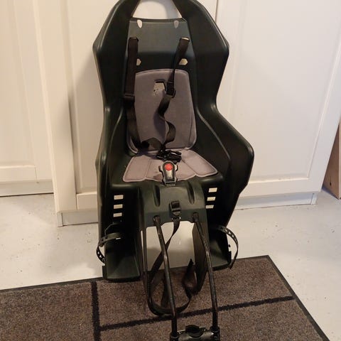 Sædet har 3-punkt sele, justerbare fodstøtter, spænder til sko og beslag til cyklens stel.