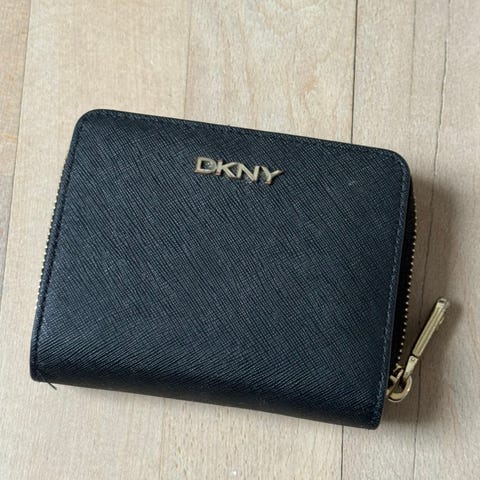 DKNY pung i læder og stof. Pungen har flere rum til kort og mønter, lukkes med knap og lynlås, og har et mønstret ydre med logo-detaljer.
