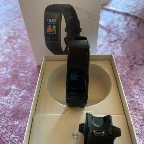 Huawei Band B5-2921 aktivitetsarmbånd. Produktet inkluderer armbånd og enhed med sensorer til aktivitetsovervågning. Designet til brug som aktivitetsmåler.