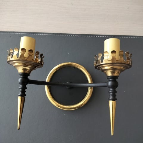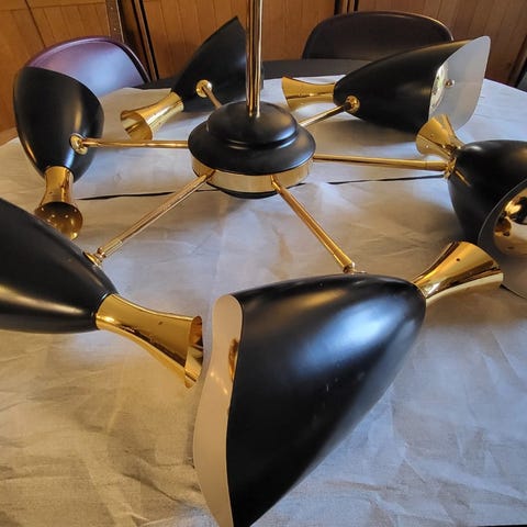 Messinglampe købt hos Johannes Larsen på Frederiksberg. 5 armet med tonede brunlige glas. Lampen er 62 cm høj og hvert glas er 23 cm høje Ø: 8 cm. Den kan pudses helt op til glans.