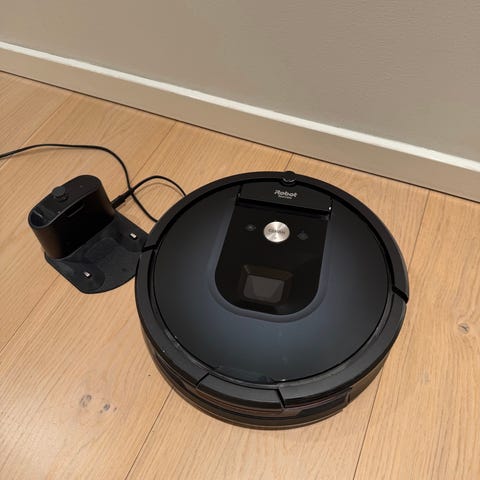 iRobot Roomba 980 robotstøvsuger med tilbehør inklusive ekstra filtre og sidebørster. Enheden hvor rullerne, sidder er defekt. For en med erfaring med reparation af IRobot støvsugere, er det en nem reparation ifølge diverse YouTube videoer.