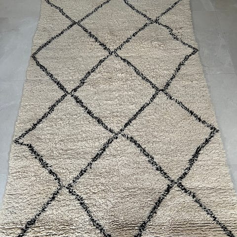 Ægte uldtæppe fra Marocco. Stort gulvtæppe med det klassiske mønster. Flot stand, dog en lille brun plet som nok nemt kan fjernes.