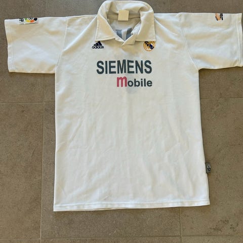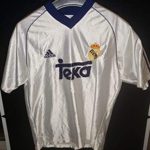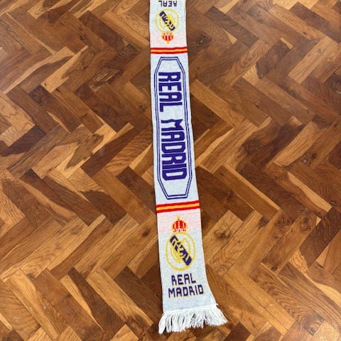 Vintage Real Madrid tørklæde i officiel merchandise-udgave med klublogo og tekst. Halstørklædet har farverne hvid, rød og gul, og er designet til fans af fodboldklubben Real Madrid.