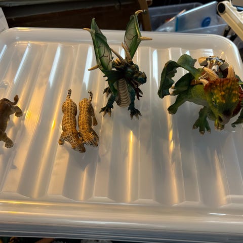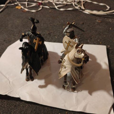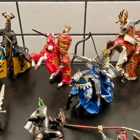 Schleich ridderfigurer og drage legetøjssæt med forskellige ridderfigurer udstyret med sværd, skjolde og hjelme samt en sort og rød drage med bevægelige vinger.