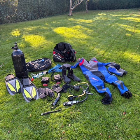 Tecnogear våddragt og dykkerudstyr sæt indeholder to våddragter, flere par finner i forskellige farver (gule og sorte), handsker, snorkelmasker, vægtbælte samt andet tilbehør til dykning. Udstyret er velegnet til dykning og snorkling og inkluderer materialer som neopren og plastik.