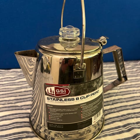 Stor emalje kaffekande til brug på vandre-/campingture. God kvalitet og flot stand. Fra GSI Outdoor (8 cup percolater)
