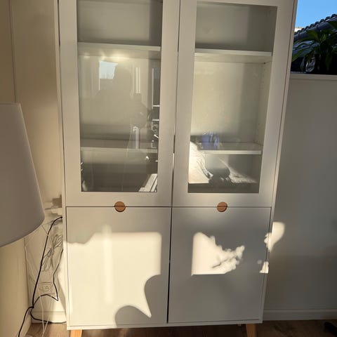 Hvidt vitrineskab med glaslåger i øverste halvdel af lågen. 5 hylder medfølger. Brugt men ingen skader. Et par bittesmå brugsspor som ikke ses.
