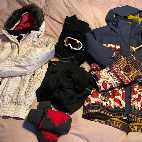 Alpint skitøj i mærket Brunotti i friske/ungdommelige farver med jakken i gråmeleret mønster og bukser i orange.