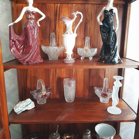 På grund af flytning sælger vi mange interessante pynte genstande: nips, krystal vaser, porcelæns statuer mm. Næsten ALT i skabet på billederne koster 50kr per stykker. Men små tjekkiske krystal glas nips (to kurve, to kyssende svaner, et skib, en påfugle osv) koster 30kr per stykker En stor farvede glas Paradise fugle (blomst) fra Prag koster dog 50 kr