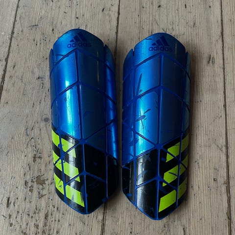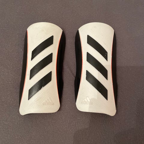 Adidas F50 benskinner med integreret fodbeskytter. Farve: Rød og sort. Størrelse: 12-14 år. Materiale: Plast og tekstil. Designet til beskyttelse under fodboldspil.