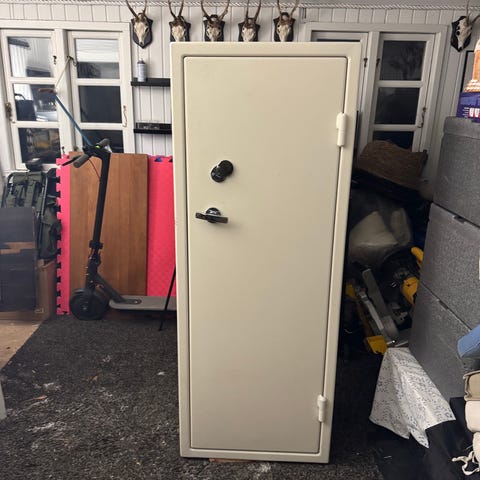 Sælger 2 ens våbenskabe i neutral grå farve. Skabene fremstår solide og i pæn brugt stand, med lås og nøgle. Velegnede til sikker opbevaring af våben (5 geværer pr skab) eller værdigenstande.