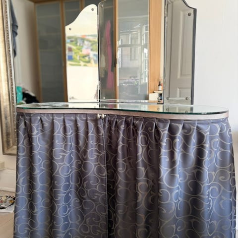 Sminkebord i fin stand. 100x42x70 cm (længde bredde højde). Spejlet måler 51 cm i diameter.