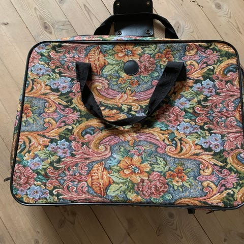 (sort) med bærehank. Har 3 store rum + flere rum med lynlås. Har lås og nøgler er vedlagt. H: 33 x L:42 D: 19 cm.