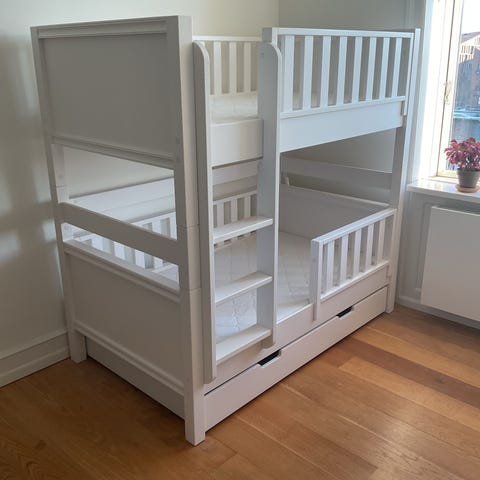 Køjeseng fra Et hjem. Model Fanny 90x200. Kan laves om til 2 enkeltsenge. Med sengehesten til begge senge, både for og bag. Stige + original skuffe (90x200) til under seng medfølger. Sælges uden madrasser. Prisen er fast.