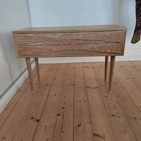 Arne Vodder sengeborde. Smuk og klassisk form .. hvid stel og på toppen en glasplade med sort baggrund ( kan males op hvor det er afskallet… mal den evt i en farve der passer til dig. Mål B46,5 D28 H45 pris for sættet 950,-