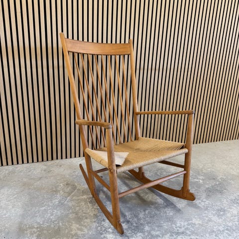 Hans J. Wenger gyngestol af sæbebehandlet bøg. Sæde af flettet papirgarn. Model J16, fremstillet hos Kvist møbler. Jubilæums model. H. 97/42 B. 64 D. 78 cm.
