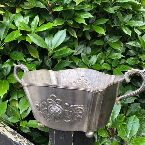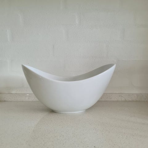 Flot gammel oval skål i hvid porcelæn med dekorative løvehåndtag på siderne. Skålen har en glat overflade og en enkel, tidløs form. Velegnet til servering eller dekoration med blomster. Lille afskalning i den ene ende ved bunden,som er limet flot - se foto. Kan nok ikke tåle at komme i ovnen.