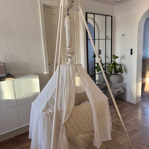 Original Moonboon slyngevugge med motor, stativ og helt ny afstiver madras fra april 2025 sælges, da vores baby ikke længere vil bruge den. Moonboonen er Ikke brugt særlig meget. Ca. en gang dagligt. Afstiver madrassen er helt ubrugt og stadig med mærke fra butikken.