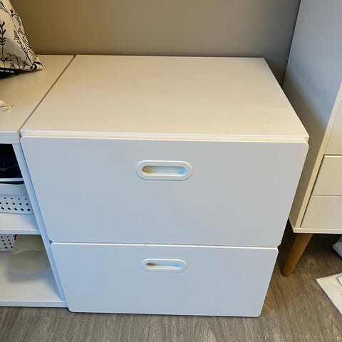En kommode med 1 grøn og en sort skuffe og indstillelige ben.