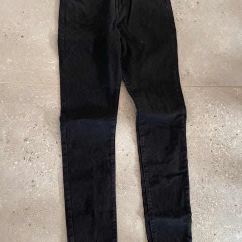 Workwear inspirerede jeans med lommer for og bag plus en strop og lille lomme på siden. Lige ben med opsmøg forneden. Opsmøget vil jeg sige de er som en længde 30-32, er man høj kan man folde dem ned (opsmøget er ikke syet fast). Elastisk materiale.