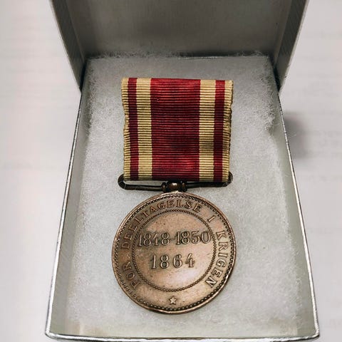 Erindringsmedalje med bånd, der relaterer til Treårskrigen mellem Danmark og Slesvig. Medaljen har en rund form og et bånd med striber i rød og hvid.