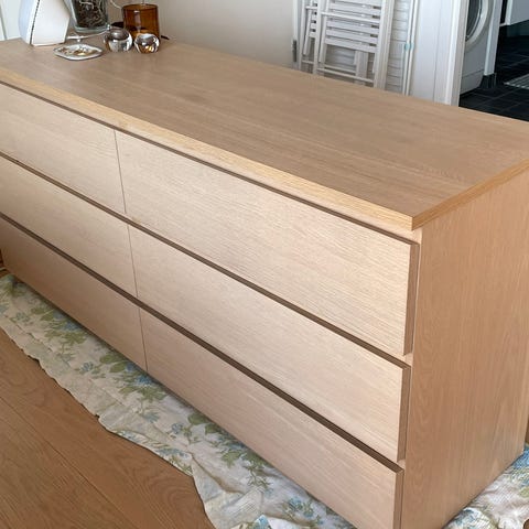 IKEA Malm kommode i trælook med 6 skuffer. Kommoden har en enkel og funktionel design med god opbevaringsplads, velegnet til opbevaring af tøj eller andre genstande i hjemmet. Købt i januar 2025.