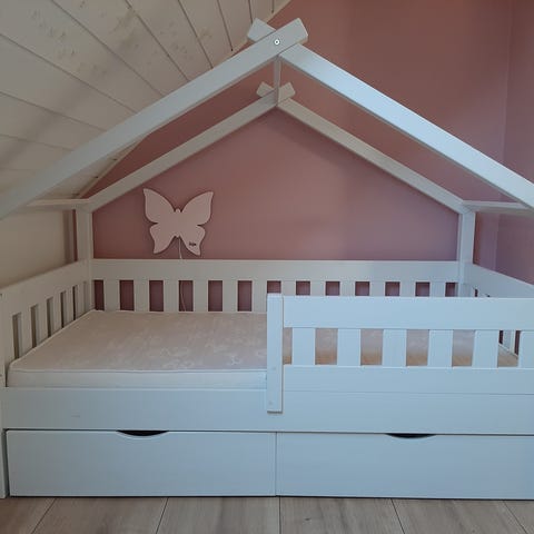 Flot husseng fra Bonlulu med stor opbevaringsskuffe under sengen. Sengen passer til en madras i størrelsen 80x160 cm. Der er nogle brugsspor, som fremgår af billederne.