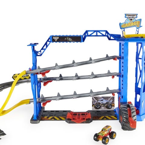 Garagen indeholder arbejdslift, bur, dinosaurkranie og dinosaur-bilkaster.