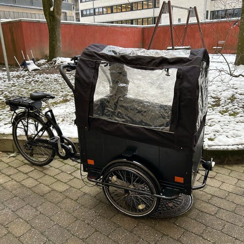 Bought in 2019. Well-maintained and in good condition, ready to ride. New hood(kaleche) with high-quality zippers. The hood is quite tall in size, allowing taller children to sit comfortably. Newly fitted 3 x Schwalbe Big Ben Plus puncture-proof tyres. Front disc brakes + rear V-brake. ABUS 170 cm chain lock + rear ring lock included. I have a receipt for the bike and the locks.